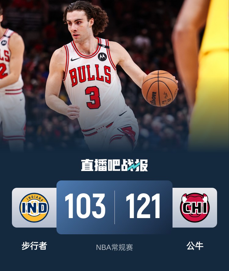 比赛开始后步行者轮番冲击内线取得领先,基迪也接连砍分帮助公牛追上比分,首节两队打得势均力敌。第二节上来基迪延续火热手感单节再度得分上双,怀特也接连砍分,他们联手带领公牛单节轰下40分将比分拉开。易边再战,步行者进攻端依旧表现平平,公牛始终掌控场上局面,基迪第四节崴脚离场,步行者始终未能追上比分,最终公牛121-103轻松击败步行者取得3连胜,步行者遭遇3连败。