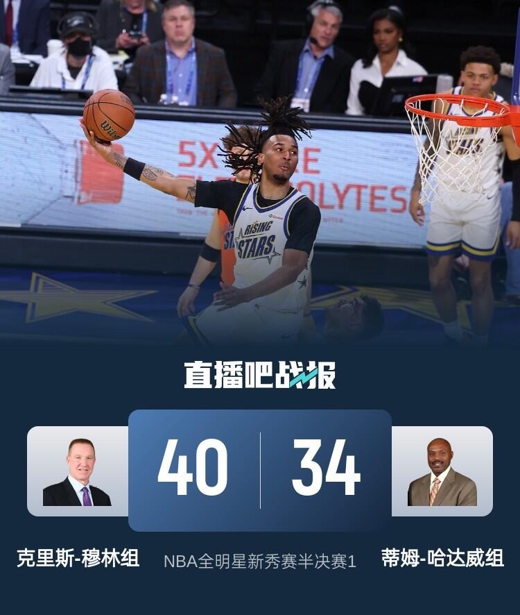 2月15日讯 NBA全明星新秀半决赛,克里斯-穆林组率先对阵蒂姆-哈达威组,比赛采用先拿到40分就获胜结束的赛制。