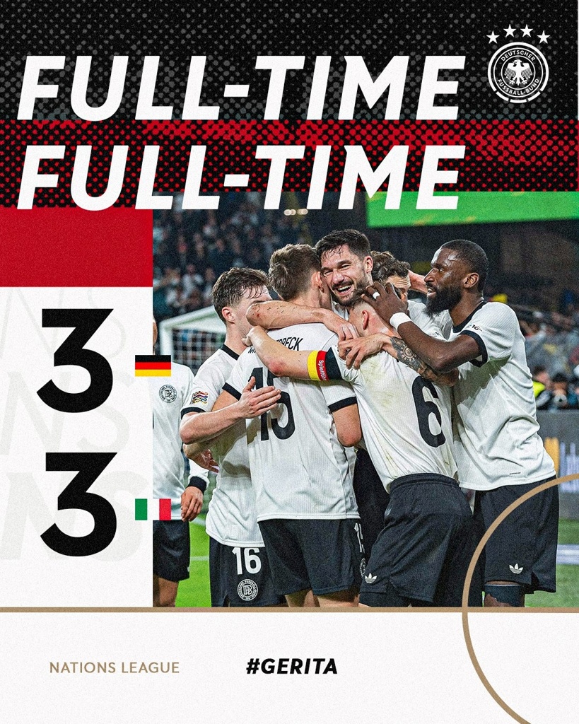3月24日讯 北京时间3月24日03:45,欧国联八强战次回合德国迎战意大利的比赛在伊杜纳信号公园球场进行,上半场克莱因丁斯特造点,基米希点射首开记录,穆西亚拉推射扩大比分,基米希助攻克莱因丁斯特头球再下一城,下半场基米希失误小基恩抢断破门扳回一城,随后小基恩兜射破门再扳一城,拉斯帕多里补时点射,最终德国3-3总比分5-4意大利晋级四强将战葡萄牙。