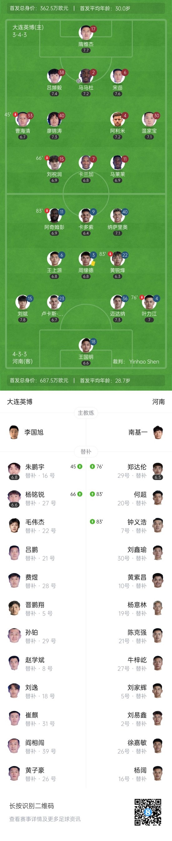 上半场补时1分钟,大连0-0河南队。