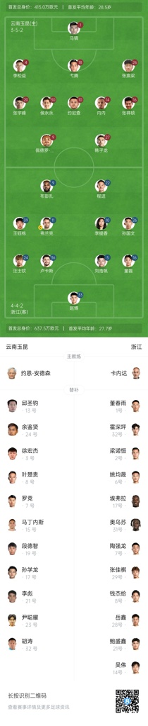 玉昆vs浙江首发:3外援PK!18岁王钰栋、侯永永先发 奥斯卡仍缺席
